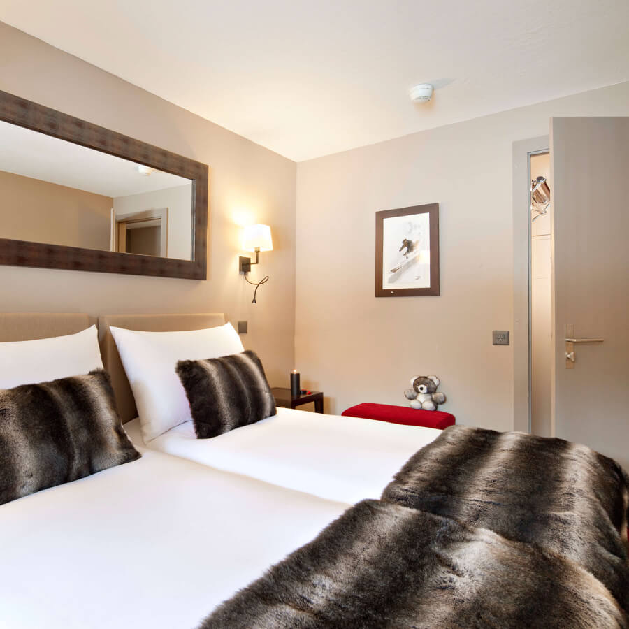 The Family Duplex is a large 70sqm duplex with the two bedrooms on the ground floor overlooking the village and an upstairs bedroom with a beautiful mountain view (this configuration is reversed in certain rooms). This room has two bathrooms and can comfortably accommodate up to 5 adults.